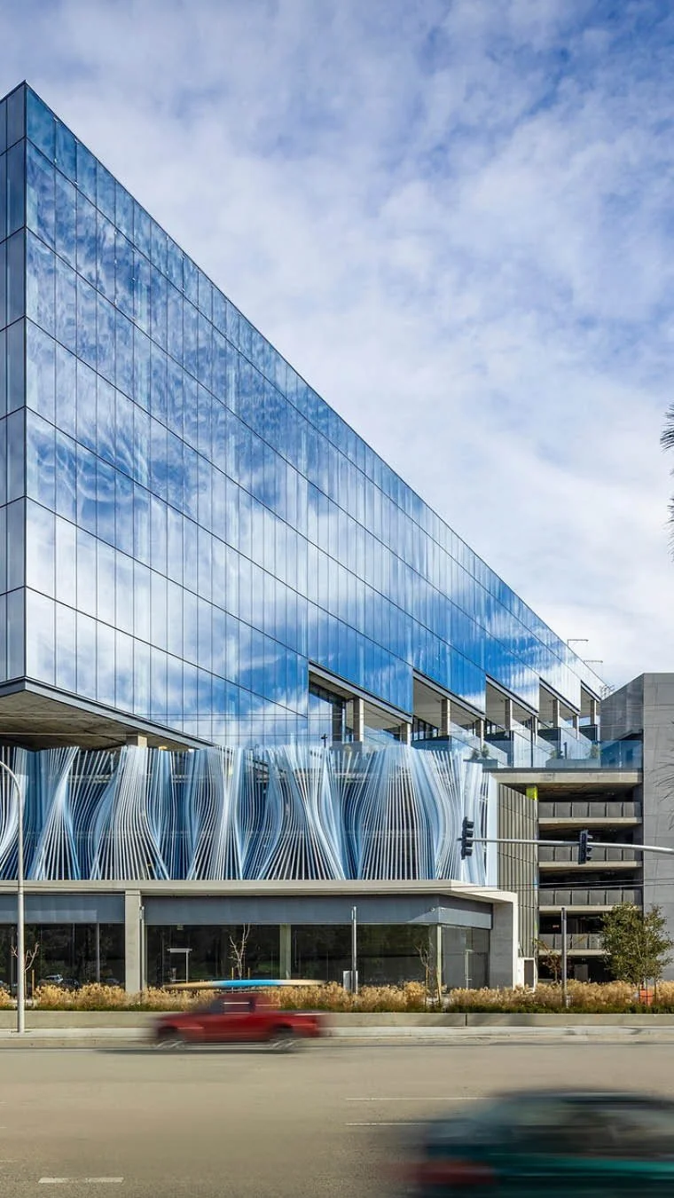 Inspired by the wetland grasses of the Ballona Watershed, Rob Ley's public art piece, Ensemble, is a dense, surface-like configuration of hundreds of individual aluminum tubes on the edge of Culver City's Entrada building.